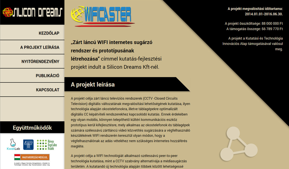 Feladat leírása: Silicon Dreams Kft. – projektszintű nyilvánosság és publikációs tevékenység Webcím: www.wificaster.hu Publikáció Kutatási projekt zárt láncú WIFI internetes sugárzó rendszer létrehozására Kísérleti mérések az elkészült prototípuson